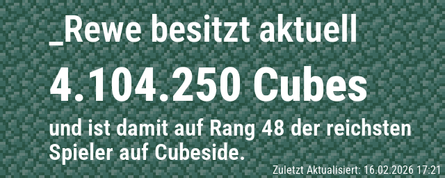 Bestimmt kennt ihr ja alle das offizielle Cubeside Banner, das auch ich in der Signatur habe. Leider zeigt dieses allerdings keine Cubes an was ich irgendwie immer schade fande, und da ich etwas programmieren kann, habe ich das ganze einfach selbst in die Hand genommen. Darf ich vorstellen: Das CubesBanner. Es zeigt immer eure aktuellen Cubes sowie eure Position in der Liste der reichsten Spieler an, die Daten stammen von der offiziellen Stats-Seite. Je nach dem wie reich ihr seid, hat euer Banner einen anderen Hintergrund: Unter 10k Kupfer, 10k-100k Eisen, 100k-1M Gold, 1M-10M Diamant und ab 10M+ Bedrock. Ab 1M könnt ihr auch eine beliebige Block-Textur als Hintergrund nutzen, Anleitung in meinem Kommentar unten.